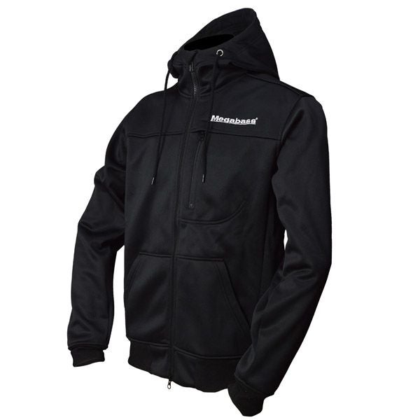 表側の生地には、高密度ポリエステルを採用しているので、風が強い日の釣行やバスボートでの高速走行時において高い防風性能を発揮します。また、口元まで隠れる形状のフードと伸縮性のある袖口のリブ加工によって、体温の奪われ易い首元や手首を冷たい外気からまもります。