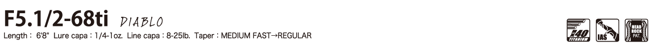 歴代「ディアブロ」の血統を正統に受け継ぐヘヴィバーサタイルシャフトの名作。チタン特有のしなやかな弾性フィールでブレーデッドジグ、ジグ、ライトテキサスなど、ライトカヴァーゲームの喰わせのコンタクトゲームを快適にこなします。この特異なロッドフィールは、ピュアカーボンロッドとは異なります。スティッフ過ぎない、「しなやかな弾性フィール」が「高感度特性」を発揮するという、独特な感覚が「ディアブロ」ならでは。