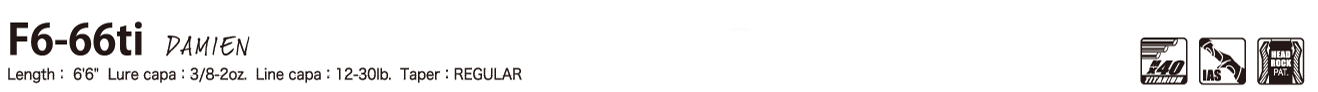 テクニカルに操作したいフロッグゲームやヘヴィウエイトルアーを緻密にコントロールするゲームを快適にこなす、「ダミアン」。666の構成値は、新たな黄金律。「獲る」ためのナンバーです。シャフトの取り回しとキャスト精度を高めた6'6"レングスは、複雑なカバーの奥へ的確にルアーを撃ち込み、ゆとりのF6パワーフォースは、MAGDRAFTシリーズ、i-SLIDE 187R、i-WING135などで、乱立するティンバーを1本1本サーチするなど、高いアキュラシーが要求される込み合う露出ストラクチャー周りの攻略やカバーのピンスポット攻略で真価を発揮。重量級ルアーを軽快、かつ快適に操るMX40スーパーチタン・ハイブリッドシャフトは、喰わせたいルアーの緻密な演出性を高め、溢れるハイトルクがモンスターのラフファイトを制圧。また、6'6"のスーパーチタンシャフトは、7フィートクラスのカーボンロッドの一般的な飛距離を凌駕。竿抜けの良い、ロングディスタンスキャストが決められます。