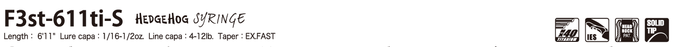 「ヘッジホッグ・シュリンジ」は、デストロイヤーの歴史的名作、HEDGEHOGシリーズ由来のソリッドティップと、EVOLUZIONシリーズのチタニウムシャフトがクロスオーバーして誕生したサイバースピニングシャフト。ソリッドティップによる、あえて曲点移動を抑えたエクストラ・ファストテーパーは、スモラバやダウンショット、ネコリグ等、超ショートバイトの確実な喰わせと優れたアタリ感知性能を求めて最適化したもの。