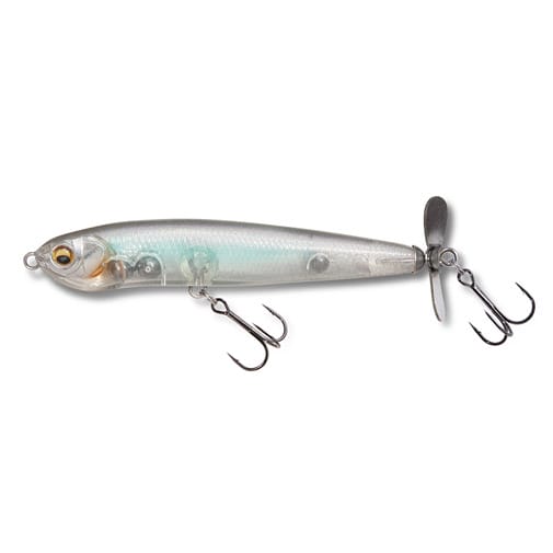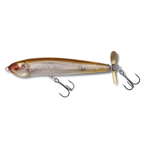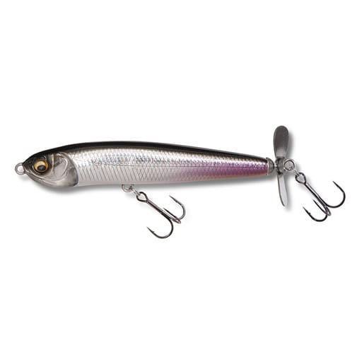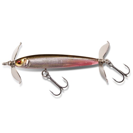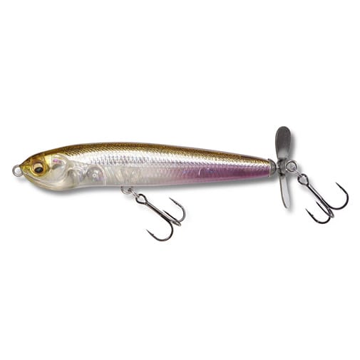 KARASHI SPINNERは、通常のI字系ルアーによるアプローチでは今一つ反応が得られなかった完全ニュートラルなバスに高い効果を発揮するプロップベイト。長距離リトリーブにおける優れた直進安定性と正姿勢への素早い復帰は、独自のキールヘッドデザインによるもの。ウィードボトムの表層~中層、シャローやオーバーハング下などで水面直下をスローにただ引きするだけでOKです。