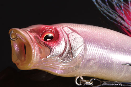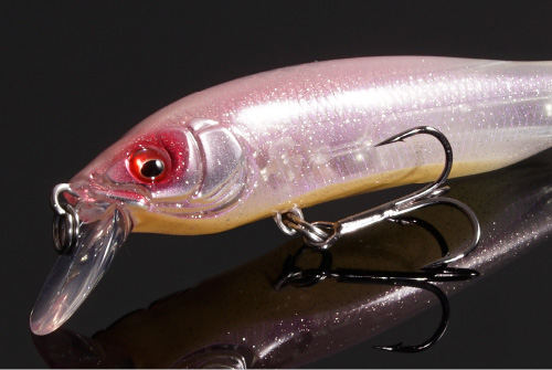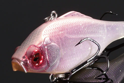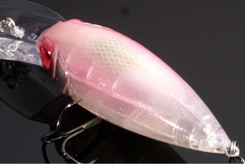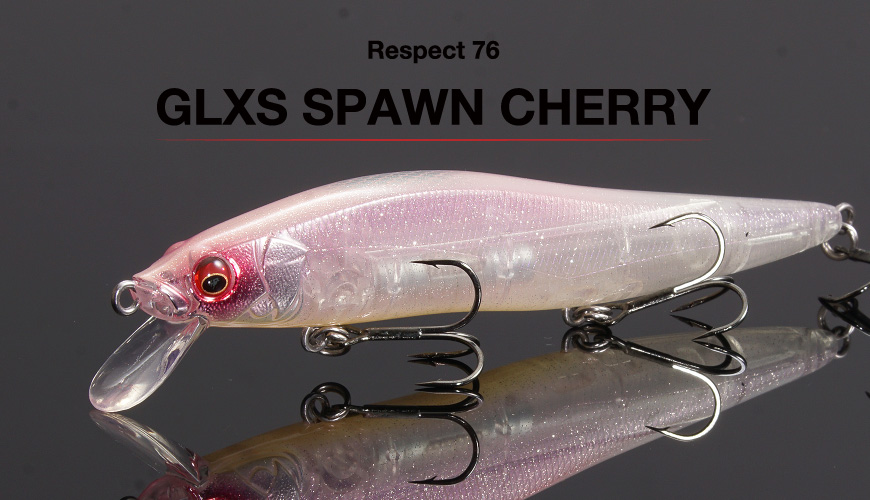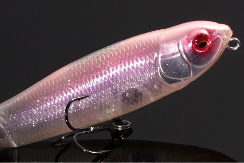 通常のGLXカラーよりも控えめに塗装されたギャラクシーラメ粒子がクリアボディと相まってシースルー感と多彩な色調変化を見せます。クリアレイクにベストマッチのカラーですが、適度なフラッシングと水馴染みの良さを両立しているので、フィールドを選ばない汎用性も備えています。顔回りのみM(メタル)箔を貼ることでシルエットをコンパクトに見せる狙いもあり、ベイトフィッシュが小さい春先に強いカラーになります。