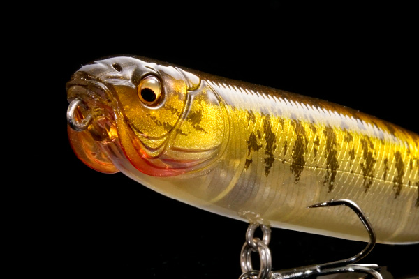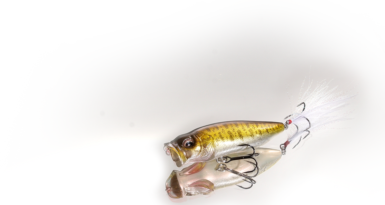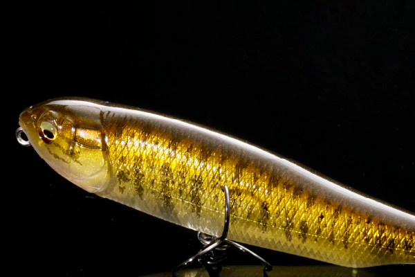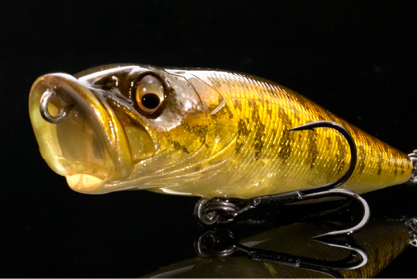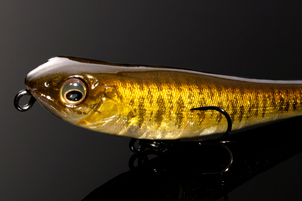 当時は国内のフィールドでスモールマウスバスが釣れるという話が出始めた頃だったこともあり、ポップXにはグリーン×シルバーのGGバス(ラージマウスバス)と、ブラウン×ゴールドのSGスモールマウスバスを姉妹カラーとしてラインナップ。これは単に2種類のバスをイミテートしただけのカラーというわけではなく、類似したカラーでありながらトーンの違いやフラッシングの強弱によって水色に応じたカラーセレクトを可能にするという明確なコンセプトによるもの。フラッシングを重視したGGバスに対し、SGスモールマウスバスは絶妙な透明感による水馴染みを重視しており、堆積した落ち葉や流木からにじみ出たタンニンによってブラックウォーター化したフィールドでは絶大な威力を発揮するだろう。