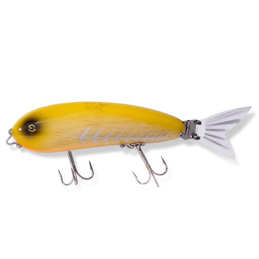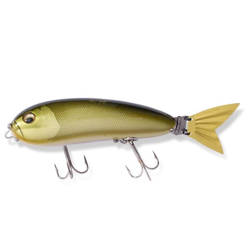 オルカ最大の特徴とも言える、金属製フラップテールは、ロッドワークによるアクションとともに左右へのドッグウォーク(ターン)と連動して、水面をキックしながら、なまめかしくひるがえり、水面を叩き、水を攪拌しながら独特なスラッピングアクションを披露。