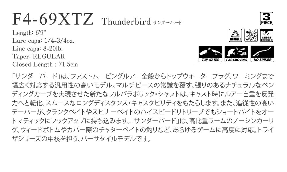 「TENSION(張り)」=「TORQUE(引張強度・粘り)」=「TORSIONAL RIGIDITY(ネジレ剛性・耐負荷強度)」の3つのT要素を3ピース・ジョイントコネクター各部位にそれぞれ特化させ、ロッドブランクストータルのパフォーマンスを引き上げるコンセプト。ファストムービングロッドと食わせのソフトベイトロッド、テンションを重視したライトジグロッドでは、それぞれのシャフトに必要とされるT要素配列を変えて、各部位ごとに合理的にシャフトエンジニアリング。テーパーデザインによっても組み合わせを変えています。 |